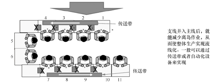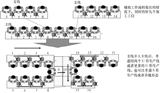 如果支線由多個工位組成,就可以考慮使用雙U形生產(chǎn)線布局方式,或者把更多的U形生產(chǎn)線組合在一起。下面的案例是將兩個支線組合成一個U形生產(chǎn)線,然后通過工位9和工位10將物料進行匯總以實現(xiàn)連續(xù)流。支線并入主線方法如下圖。