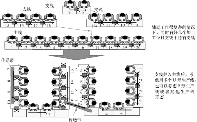 更為復雜的情況是支線上還有支線,這就需要組合各種連線方式進行連續(xù)流作業(yè)。支線并入主線方法如下圖所示。